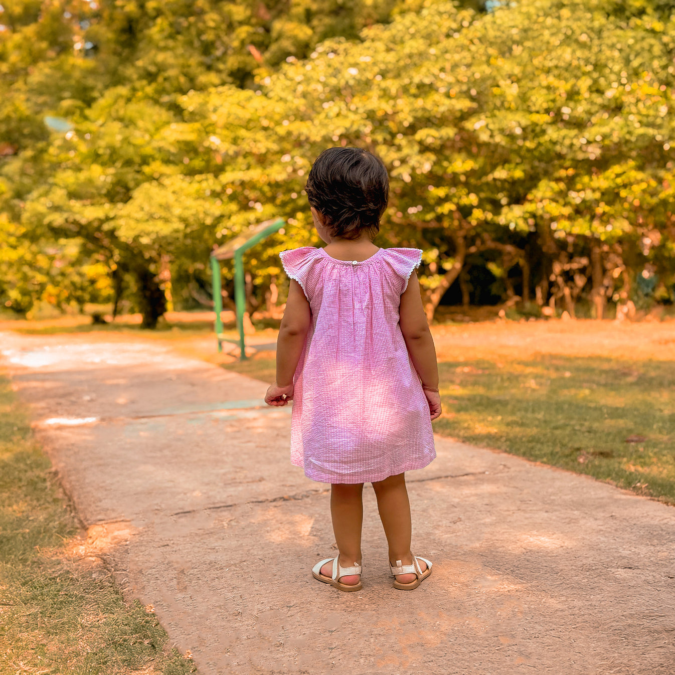Soft cotton, hand-smocked embroidery, and fluttery straps—this pink gingham dress for girls is made for twirls and sunny afternoons. The gentle ruffles and lace details add a touch of sweetness without ever compromising on comfort.
