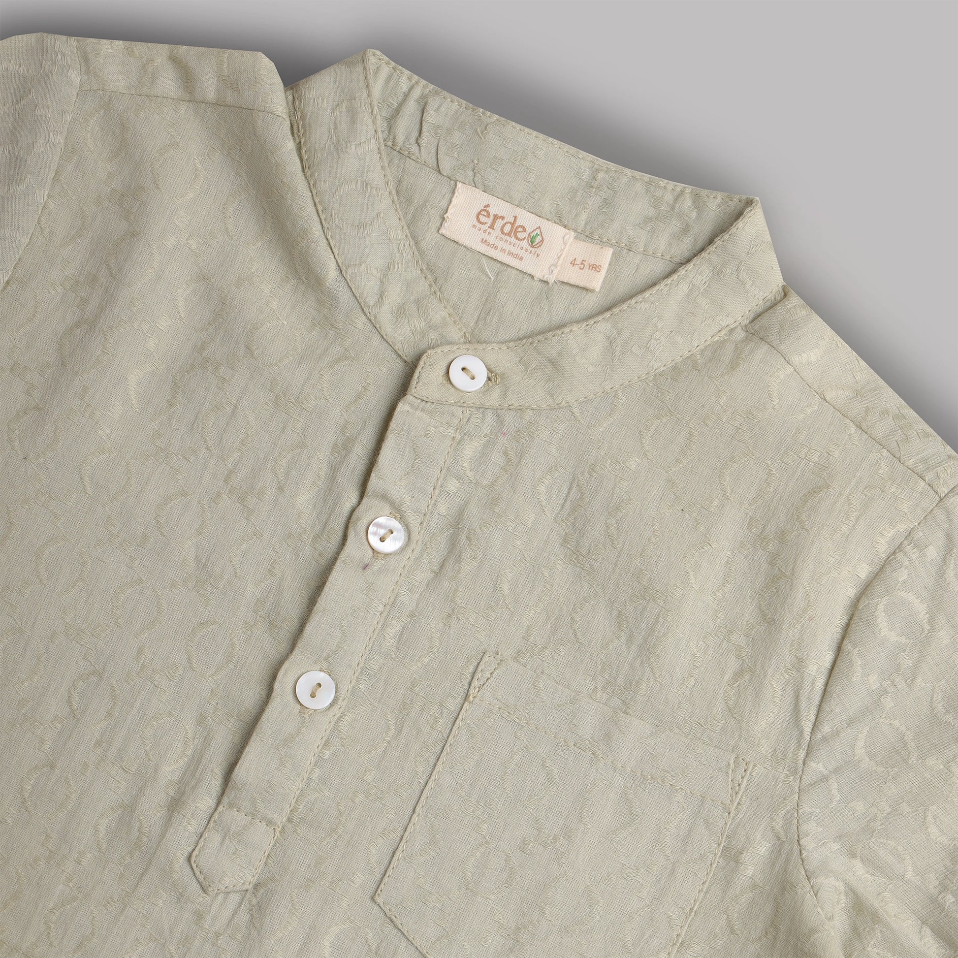 The PistachioSet redefines festive dressing for boys with its modern simplicity and artisanal texture. Made from a cotton embroidered base fabric, the set combines comfort with subtle luxury. The soft pistachio green tone gives it a contemporary charm while staying true to festive elegance.