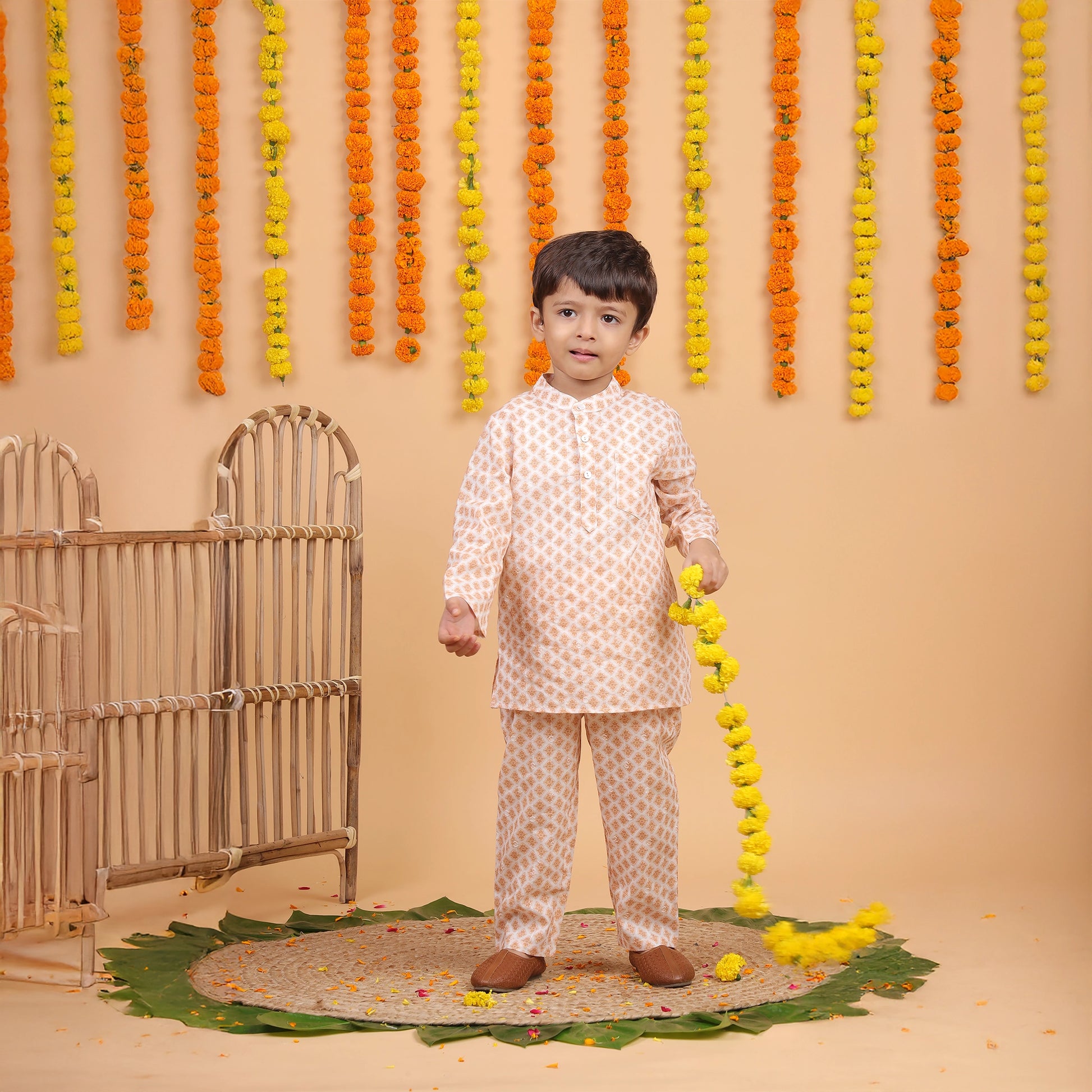 The kurta showcases a Mandarin collar, button-down half placket, and full sleeves, offering an elegant yet easy fit. Paired with matching straight-fit trousers, this coordinated set is as breathable as it is stylish — perfect for little boys who love to move freely while looking their festive best.