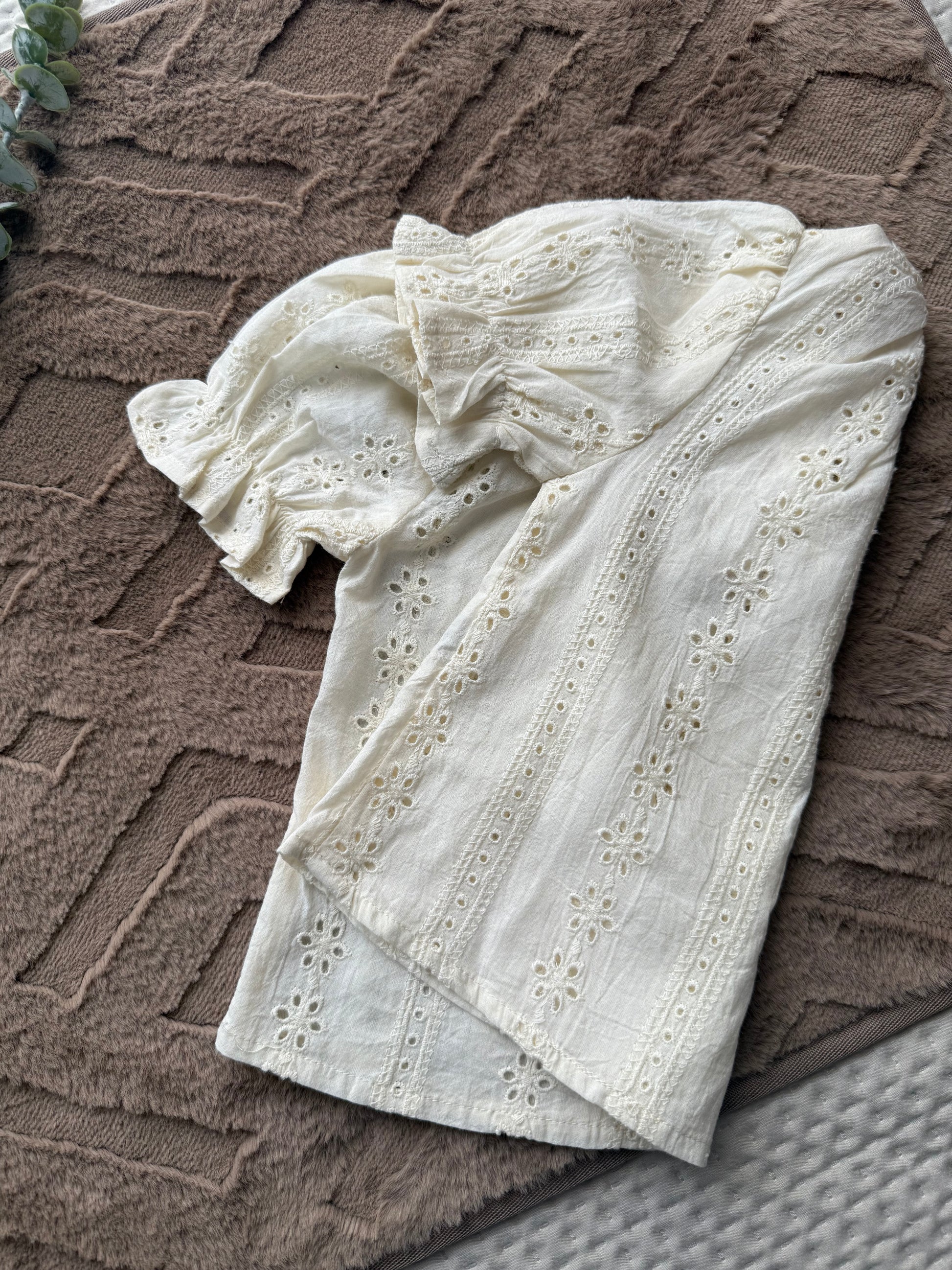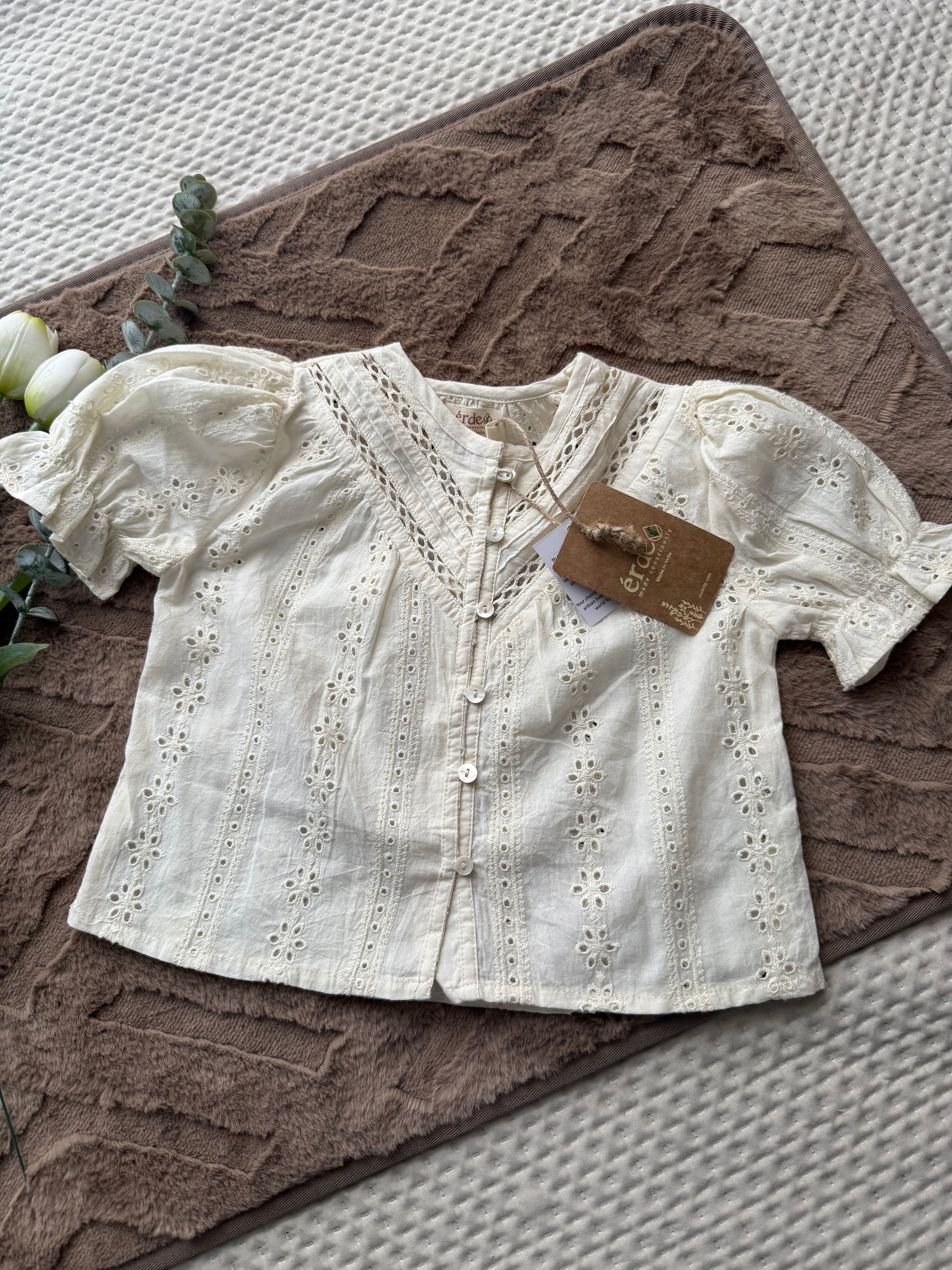 The Remi Top is a soft, statement blouse for little explorers who find joy in details. Made from airy cotton with all-over eyelet embroidery, gentle gathers, and ladder lace inlays, it blends comfort with old-world charm. The button-down front and puff sleeves add a playful vintage feel β perfect for warm weather dressing thatβs both effortless and elevated.